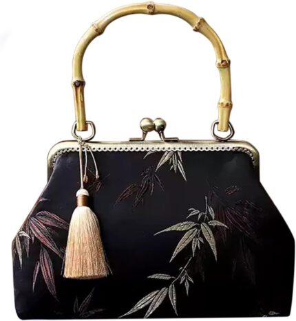 Handcrafted Bamboo Handle Vintage Silk Brocade Clutch Purse for Women’s Handbag