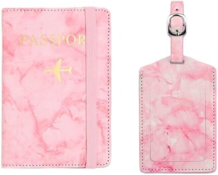 Elegant Passport Holder & Matching Marble-Pattern Luggage Tag Set for Women and Men – Premium PU Leather Travel Wallet with Mutil-Slots Design(Pink Kit) – Boosts Baggage Identification