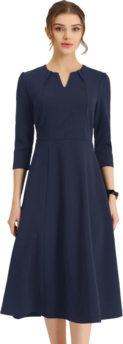 Allegra K Women’s 3/4 Sleeve Dresses V Neck Elegant A-Line Work Business Formal Midi Dress with Pockets