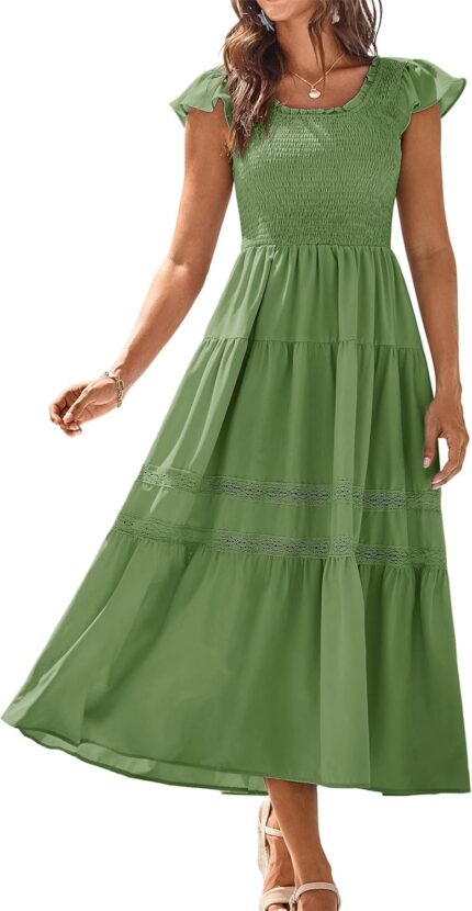 GRACE KARIN Womens Summer Dress Casual 2025 Flutter Sleeve Square Neck Smocked Waist Dresses Tiered Midi Long Sundress