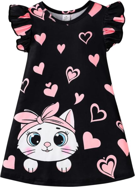 Girls Ruffle Sleeve Dress A-Line Skater Kids Cute Cat Casual Dresses Summer Sundress for 4-8 Years