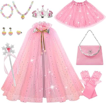 Princess Dress, Princess Dress for Girls, 11PCS Sequined Princess Cape Set with Beaded Jewelry & Bag & Gloves, Cute Princess Cosplay Up Set Birthday Gift for 3-8 Years Old (Pink)