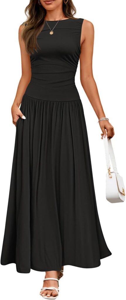 ZESICA Women’s Summer Sleeveless Maxi Dress 2025 Casual Crewneck Pleated Flowy Long Dress with Pockets