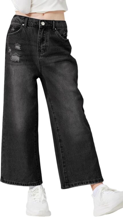 Haloumoning Girls Butterfly Print Jeans Kids Elastic Waist Wide Leg Denim Baggy Pants with Pockets 5-14Y