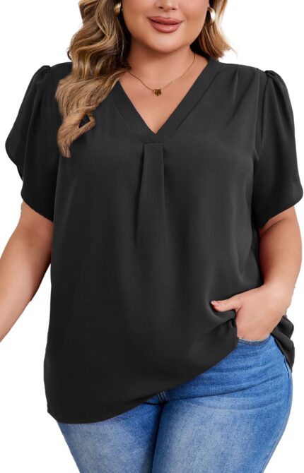 Price: (as of – Details) CARROTMOB Women’s Plus Size Dressy Casual Blouses Solid Business Work Tops Petal Short Sleeve V