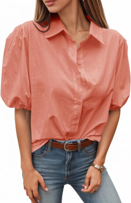 Tankaneo Women’s Button Down Shirts Short Puff Sleeve Collared Dressy Casual Blouse Tops