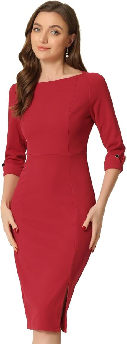 Allegra K Women’s Boat Neck Dress 3/4 Sleeves 2026 Midi Split Elegant Sheath Dresses