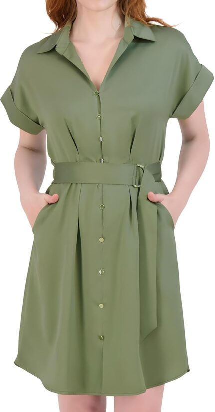 French Connection Women’s Satin Belted Shirt Dress – Knee Length, Short Sleeve, Button-Down – Casual Style for Everyday Wear