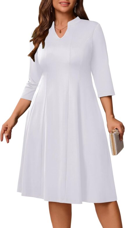 Runwind Plus Size Dresses for Curvy Women V-Neck 3/4 Sleeve Church Wedding Guest Cocktail Party Summer Midi Dress
