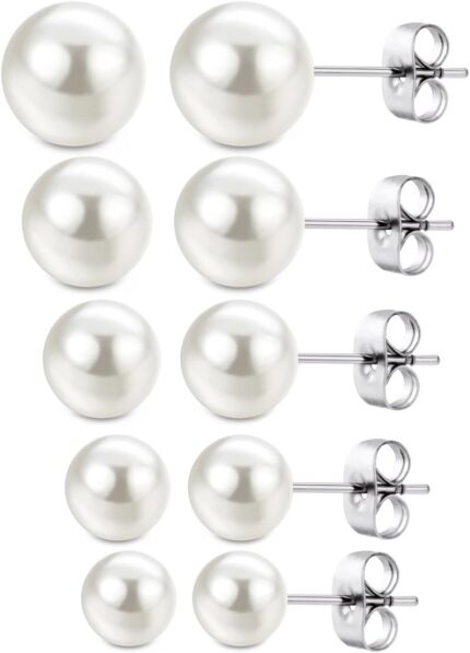 Jewelrieshop Faux Pearl Stud Earrings 5 Pairs, Stainless Steel Hypoallergenic Starter Set for Women