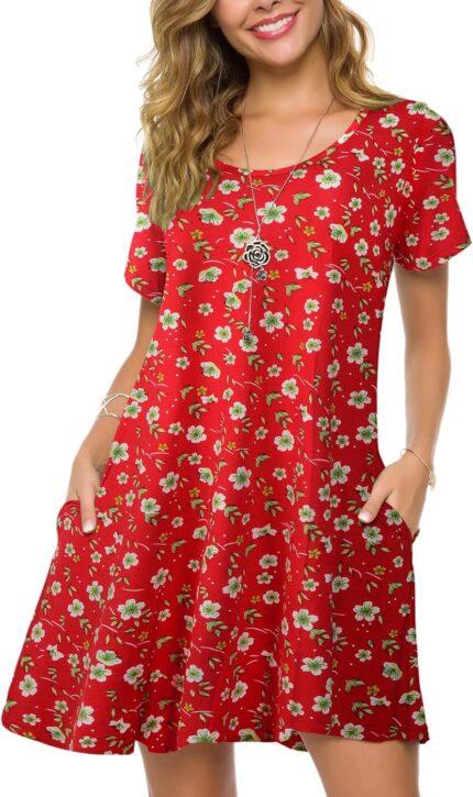 ZENNILO Women’s Plus Size Swing Dress with Pockets Casual Summer Dresses V Neck Short Sleeve T Shirt Dress for Women