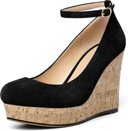 Price: (as of – Details) ★AUMOTED Women’s Wedges Wooden Heels Pumps Closed Round Toe Buckle Ankle Strap Suede Heels Shoes