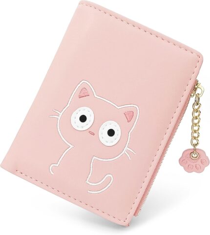Cute Wallets for Women, Bifold RFID Blocking Small Womens Wallet with Zipper Coin Pocket, Pink Embroidered Cat, Small, Fashion