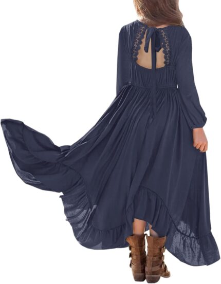 MITILLY Girls Boho Lace Flower Backless Crew Neck Long Sleeve Ruffle Swing Maxi Dress with Pockets