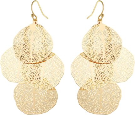 Bohemian Boho Filigree Leaf Chandelier Dangle Earrings for Women – Handcrafted Delicate – 14K Gold Plated – Lightweight