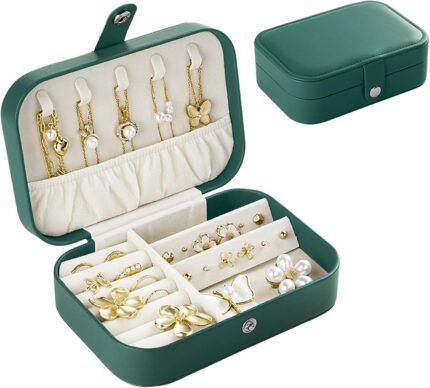 Travel Jewelry Box, PU Leather Small Jewelry Organizer for Women and Girls, Double-Layer Portable Mini Case for Earrings, Rings, and Necklaces (Emerald Green)