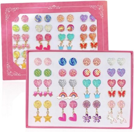 16 Pairs Kids Clip On Earrings for Girls Jewelry Earrings Princess Game Dress Up Pretend Play Earrings for Little Girls Earrings Set Gift Box, Metal, resin