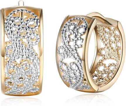 Dainty Two Tone Wide Filigree Hoop Earrings for Womens Fashion Boho Flower Chunky Huggie Hoops Vintage Trendy Jewelry