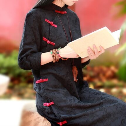 Women’s Black Jacquard Cotton Qipao Dress – Traditional Handmade Frog Button Chinese Cheongsam with Vintage Floral Embroidery