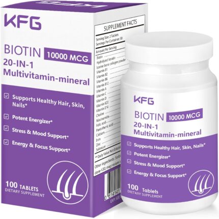 KFG Biotin, Multivitamin-Mineral, Vitamin Supplement with Biotin, Niacinamide Folic Acid & multivitamin, Supports Hair, Skin, and Nail Health for Women, 100 Tablets.