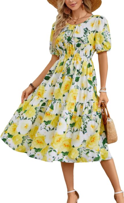 Kormei Women Summer Casual Boho Floral Round Neck Short Sleeve Smocked Waist Tiered Flowy Swing Midi Dress