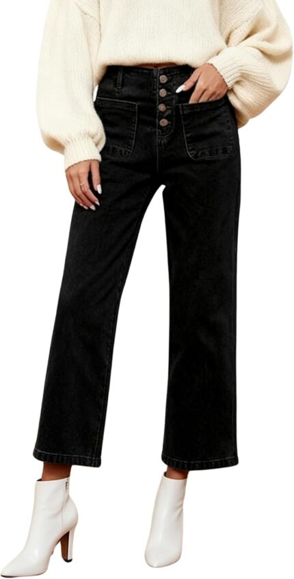Omoone High Waisted Jeans for Women Straight Wide Leg Stretchy Loose Denim Pants with Pockets