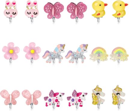 9 Pairs Girls Clip On Earrings Jewel in Box, Toddler Butterfly Jewelry, Cute Animal Clip on Earrings for Little Girls, Unicorn Earring Set, 3-10 Year Old Girl Birthday Gifts, Plastic