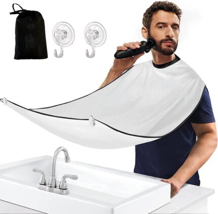 SHOWAY Beard Bib, Men’s Shaving and Beard Trimming Apron, Beard Catcher, Non-stick Waterproof Shaving Cloth, with 2 Suction Cups and Travel Bag, the Best Gift for Men-white