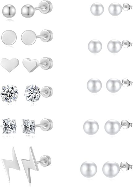 Silver/Gold Stud Earrings Set for Women, 14K Gold Plated Hypoallergenic Heart Pearl Ball Flat Back Studs Pack 316L Stainless Steel CZ Earrings Multi-Style & Size 3-8mm