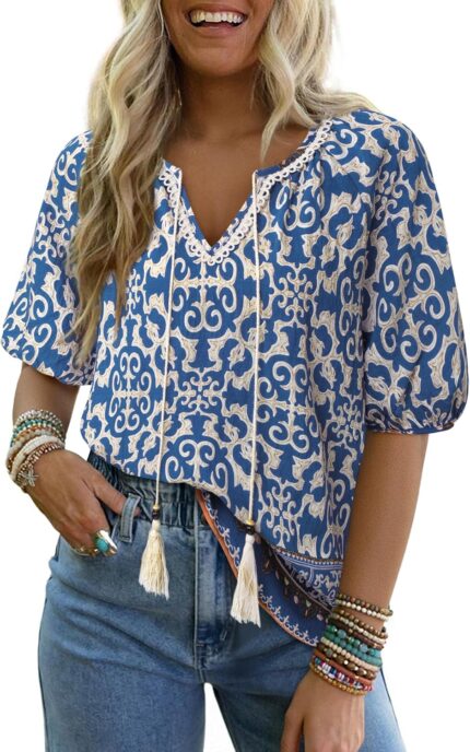 Vivilli Women’s Summer Boho Tops Casual V-Neck Short Sleeve Blouses Floral Print Shirt Tie Front Flowy Vacation Clothes