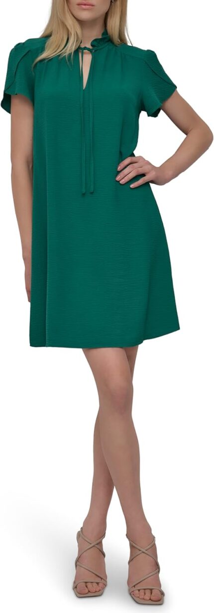DKNY Women’s Front Tie Ruffle Neckline Trapeze Dress