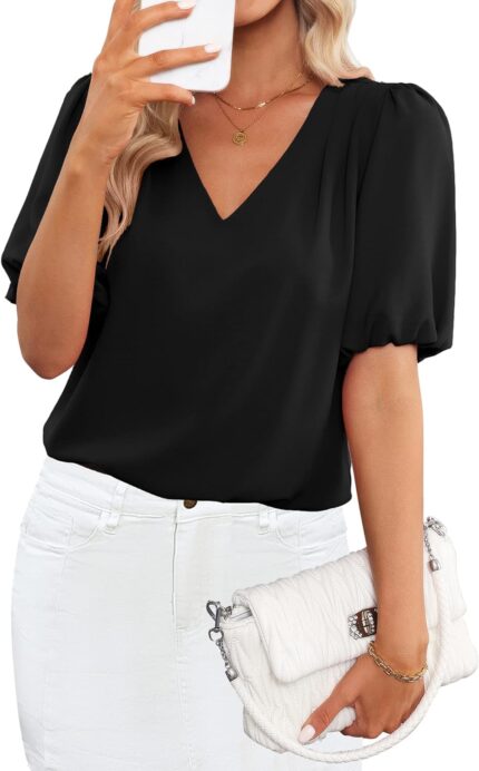 GRAPENT 2023 Business Casual Tops for Women Work Blouses Elegant Short Puff Sleeves Office Pleated V-Neck Trendy Summer Blouse