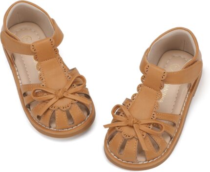 PANDANINJIA Toddler Girls Sandals Closed Toe T-Strap Kids Dress Summer Flats Sandals Cute Bow Flower Girl Shoes