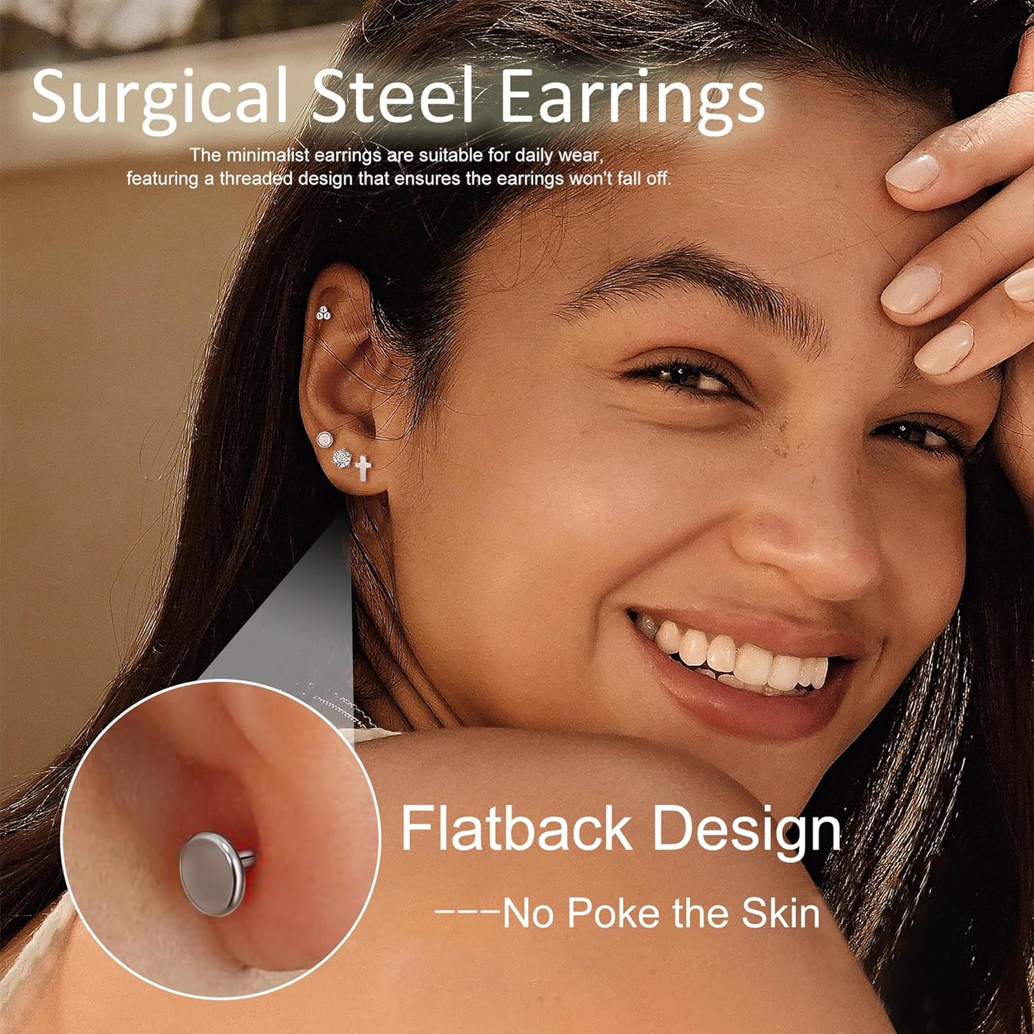 18 Pairs Titanium Stainless Steel Stud Earrings Set for Women Men – Hypoallergenic Flat Back CZ Moon Star Heart Ball Helix Tragus Lobe Cartilage Earrings 6MM 8MM
