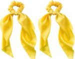 PACKAGE CONTENTS: Set of 2 yellow satin ribbon scrunchies with bow design, perfect for creating elegant ponytail styles and hair accessories