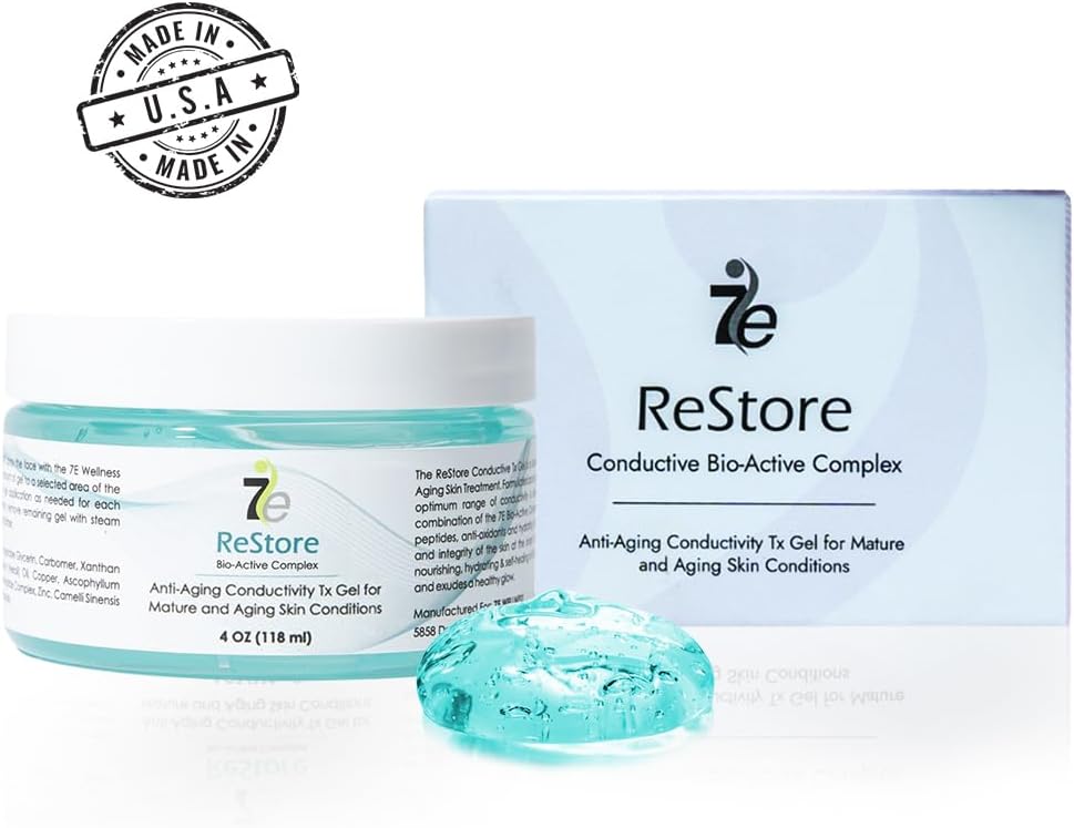 On a clean face, lightly spray with 7e Wellness RePlenish Spritzer if available. Apply a small amount of Restore Gel to the target area, then use microcurrent. Reapply gel as needed for each section. Once finished, remove any remaining gel with a steam towel and spray again with RePlenish Spritzer. Using a quarter-sized amount is recommended, adjusting distance based on the area to avoid quick drying and reduce waste.