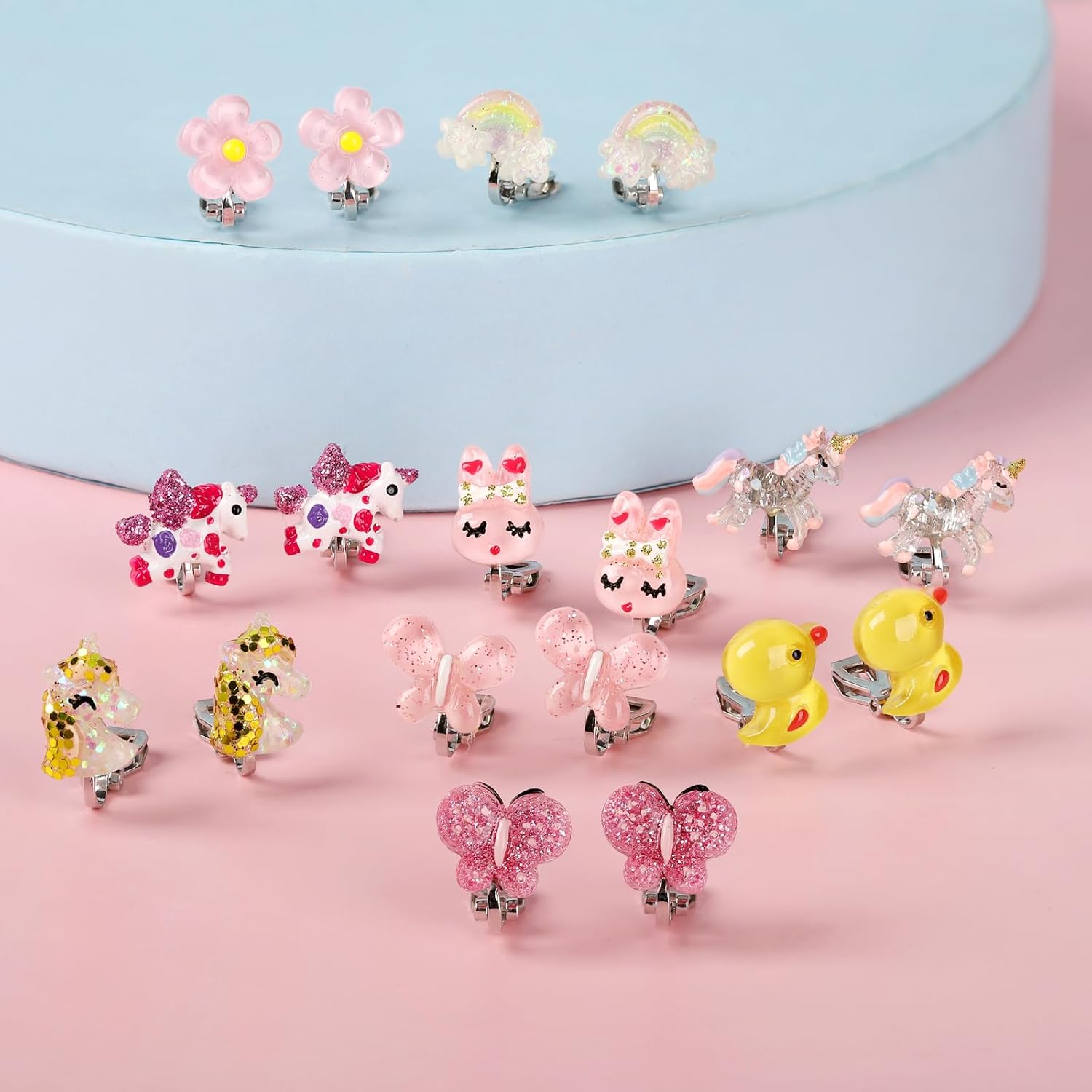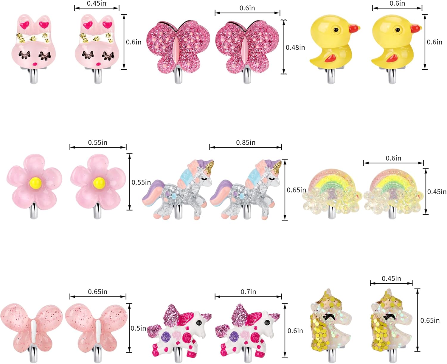9 Pairs Girl Clip On Earrings Jewel in Box, Toddler Butterfly Earrings, Cute Animal Clip on Earrings Pack for Little Girls, Unicorn Clip-on Earrings Set , 3-10 Year Old Girl Birthday Gifts