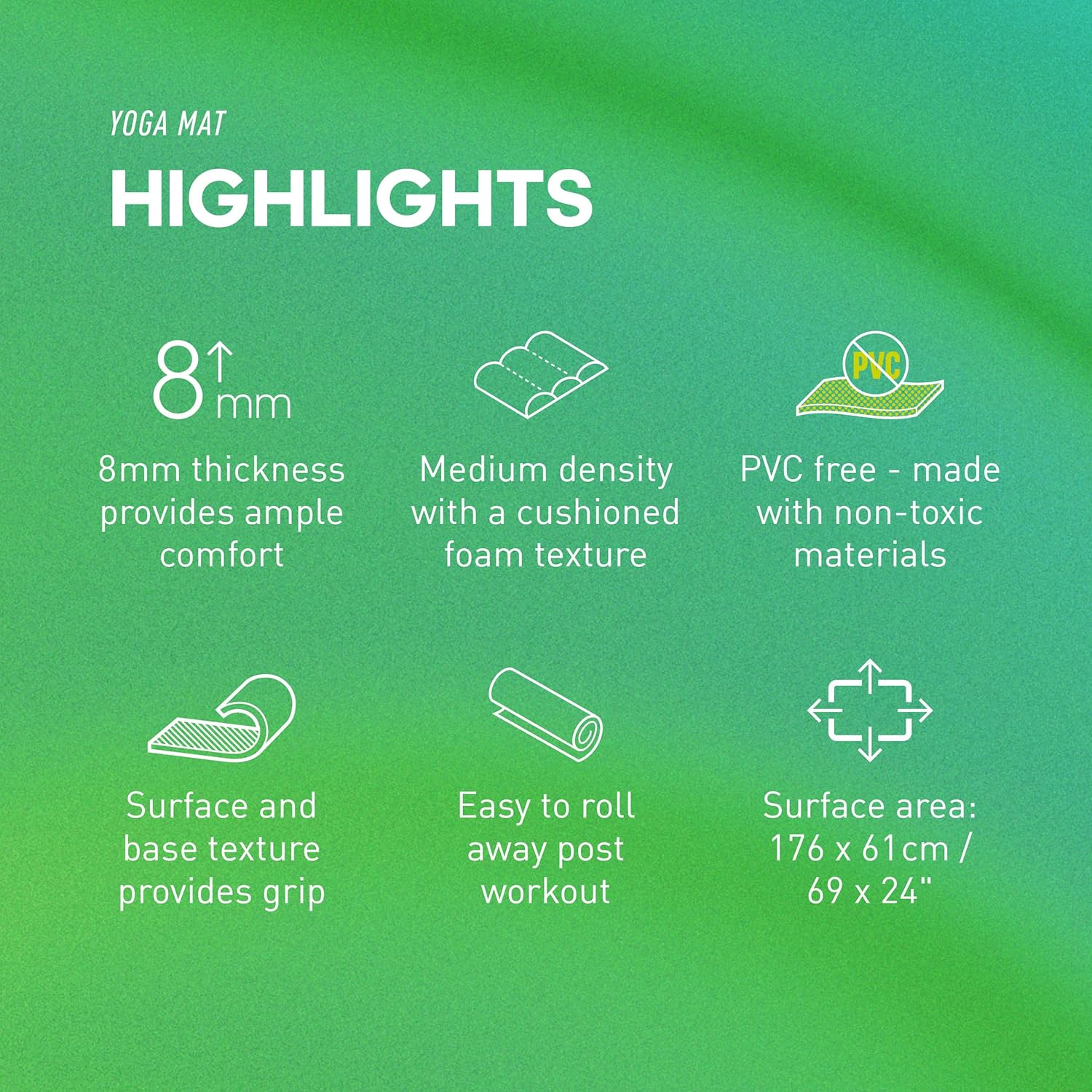 Stylishly designed while prioritizing your well-being, this work out mat is here to redefine your wellness routine. Crafted with precision, this exercising mat for floors strikes the perfect balance between support and comfort. At a thickness of 8mm, it offers an extra-thick feel that cushions every pose and provides a secure foundation for your transitions. Made from a high-quality blend of EVA foam / TPE material, this fitness mat boasts a durable yet soft foam texture that makes every session delightful. Plus, you can practice with peace of mind knowing it’s constructed using premium materials! It’s a stylish choice that feels good for both your body and the planet! Experience unparalleled grip with a subtly textured surface and base that ensure exceptional traction on all surfaces. No more worrying about slips and slides; you’ll feel confident flowing through your poses, whether at home or in the studio. With generous unrolled dimensions of 24 x 69 in, this work out mat for home workouts and formal classes accommodates yogis of all sizes and skill levels, providing ample space to explore your practice. Whether you’re a seasoned pro or just beginning your yoga journey, this workout mat for women and men is the perfect addition to your wellness routine. Elevate your sessions and immerse yourself in comfort, stability, and style with a meditation mat that transforms your practice into an inspiring experience.