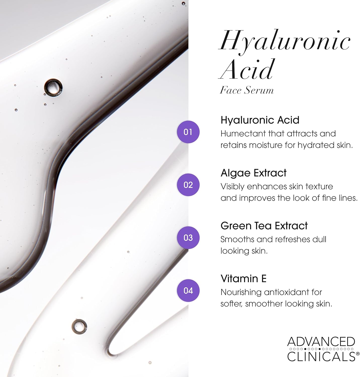 HYALURONIC ACID SERUM WITH GREEN TEA, ALGAE, & VITAMIN E – Improves skin hydration which helps visibly plump the complexion. This hydrating face serum replenishes essential moisture to dry, dehydrated skin. This blend helps to refresh dry dehydrated skin, leaving your complexion visibly hydrated and plump. The lightweight gel formula absorbs quickly for smooth looking and radiant skin.