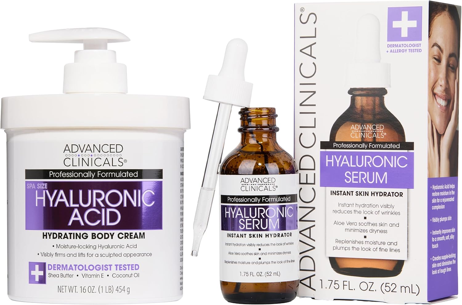 Advanced Clinicals Hyaluronic Acid Moisturizer Body Cream + Hyaluronic Acid Serum Skin Care Product 2pc Bundle, Face Serum & Body Lotion Targets Wrinkles, Dark Spots, Fine Lines, & Dry Skin, 2pc Set