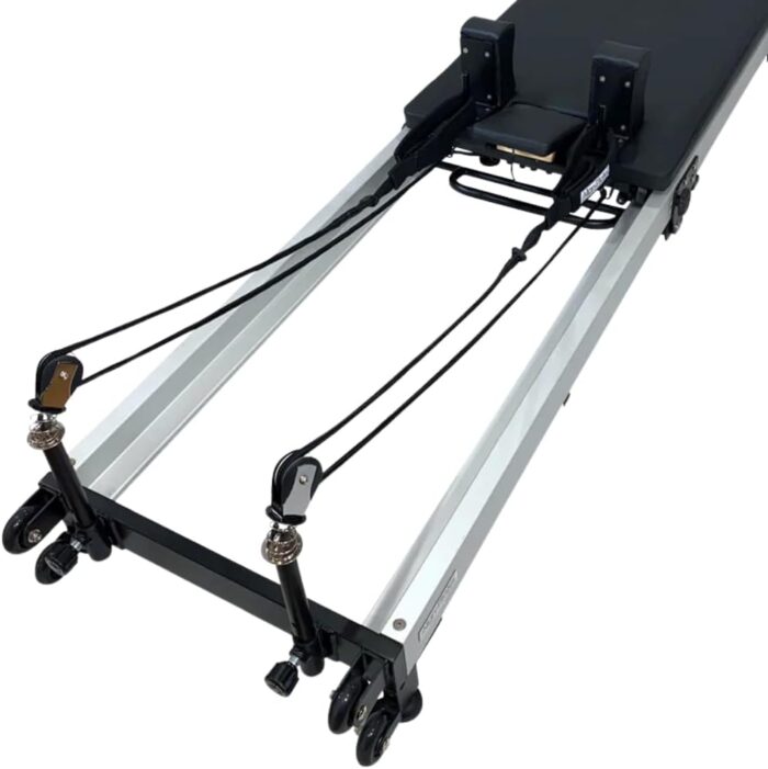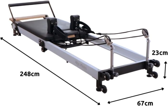 Material: Aluminum runners. Nickel Plated Spring / Carriage Drive System: Precision aluminum with 8 PU wheels / Carriage Dimensions: 89 (L) x 58 (W) cm / Carriage Travel Length: 97cm / Rope Adjustment System: Threaded rope / Rope Risers: Painted, outside frame. 3 heights / Spring: 4 springs (2 x Strong, 1 x Medium, 1 x Light) / Foot Bar: 4 positions, standard size / Dimensions: 242 (L) x 67 (W) x 23 (H) cm / Product Weight: 58kg / Max User Weight: 120kg