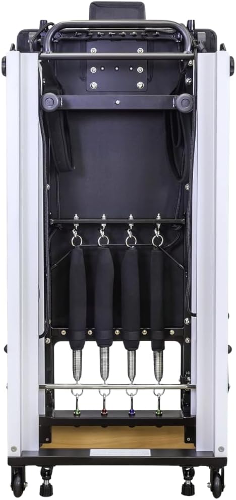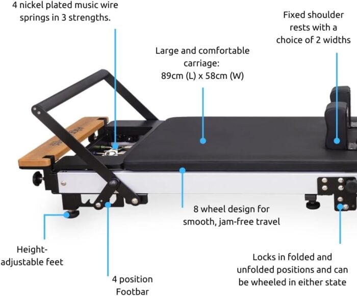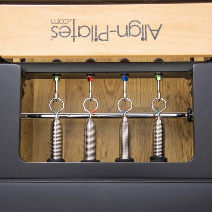 Align F3 Folding Pilates Reformer includes: Integral standing platform / Pair of Silent Double Loop Straps / 4 nickel plated quality music wire springs in 3 different strengths: 1 × light, 1 × medium, and 2 × strong