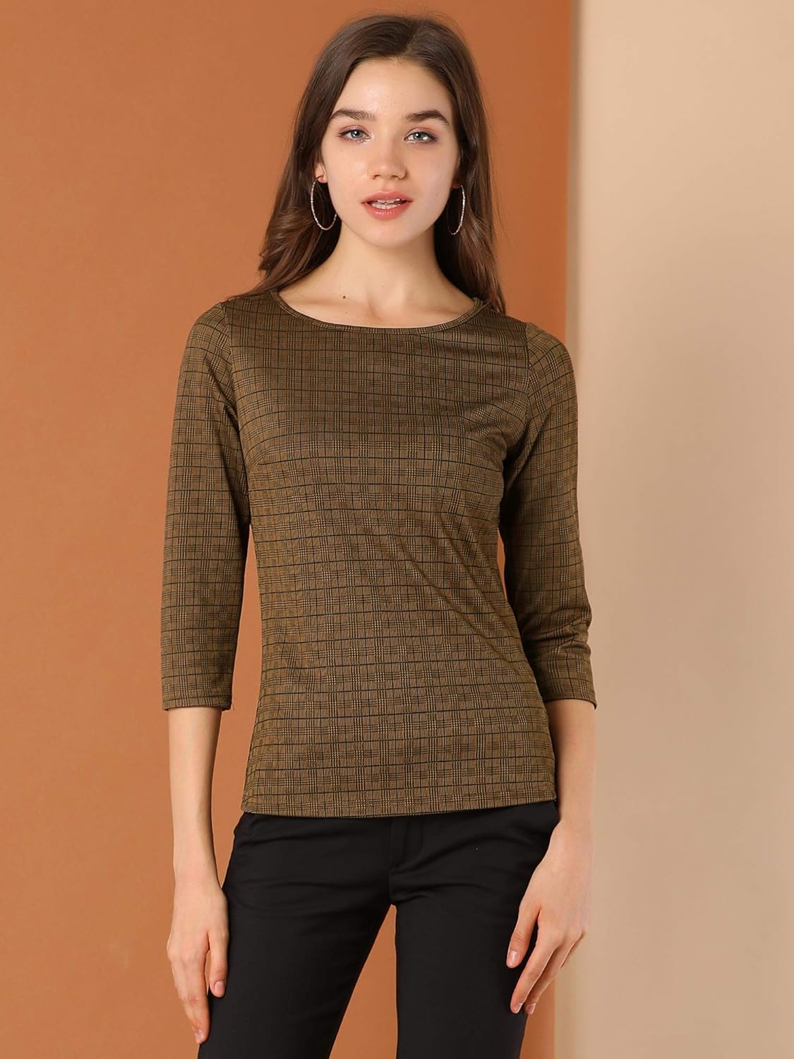 Allegra K Women’s Check Top Boat Neck Work Tops 3/4 Sleeve Plaid Houndstooth Blouse Fall Outfits