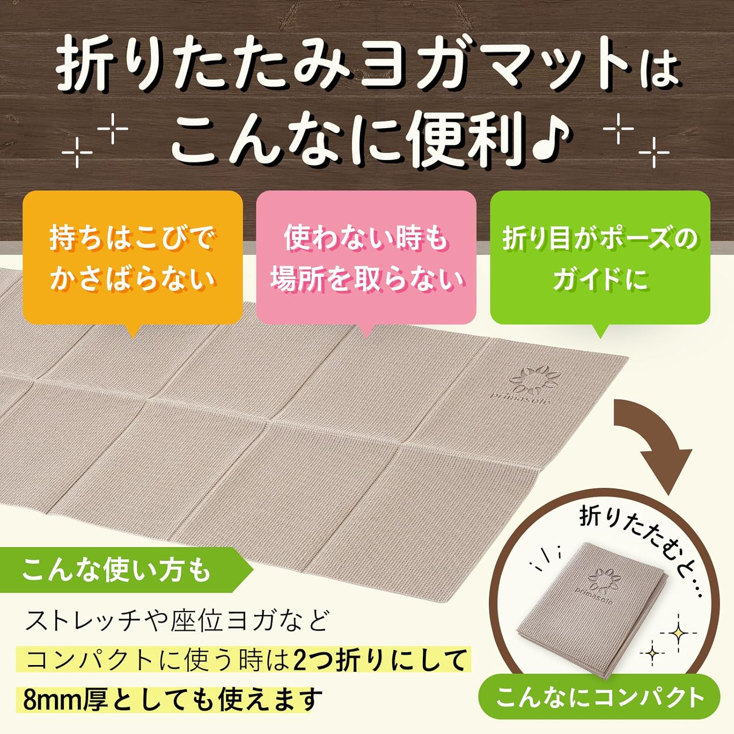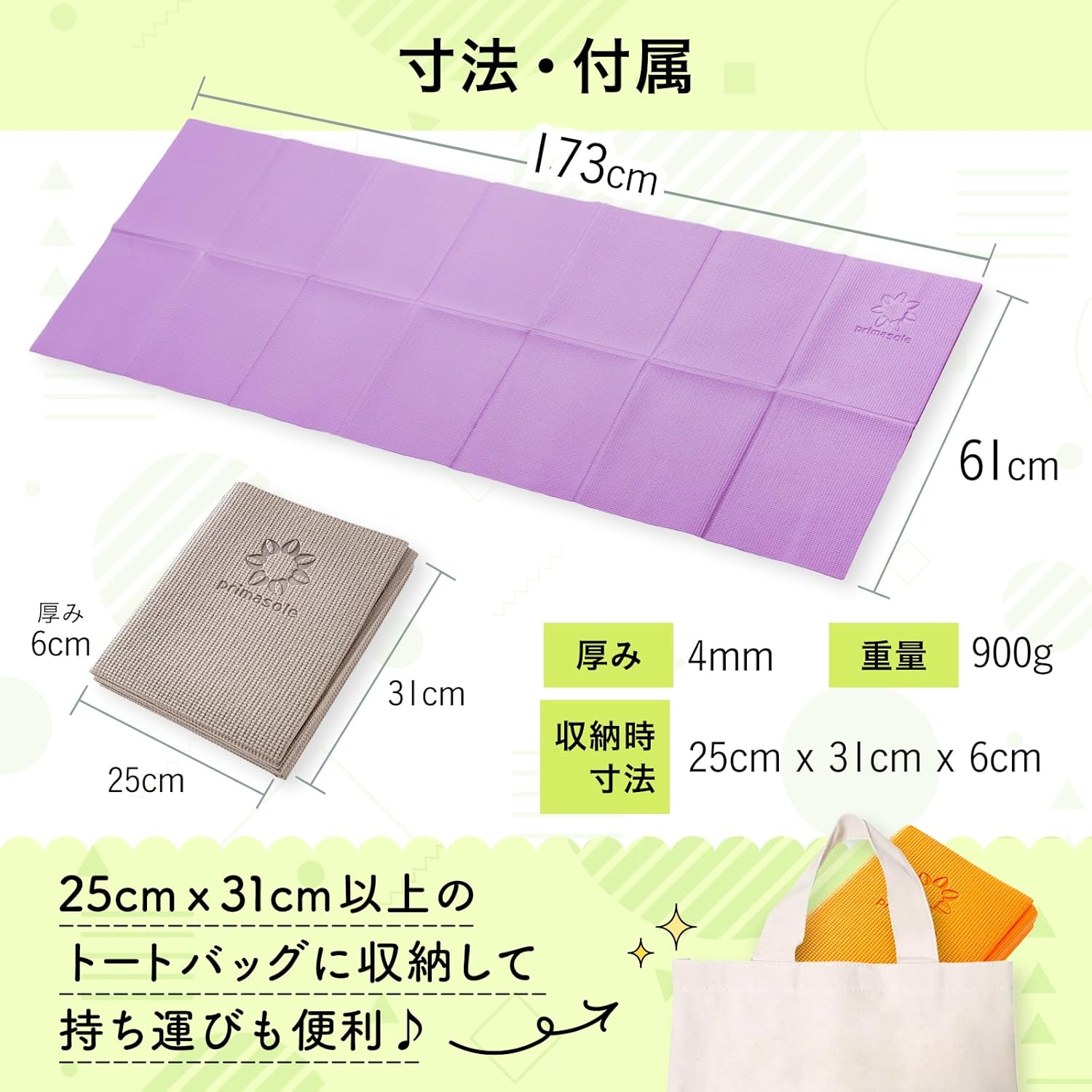 Primasole yoga mat folding type is 0.16 inch (4 mm) thick, so it is very light and when folded, it becomes a compact size of 9.8 x 12.2 inches (25 x 31