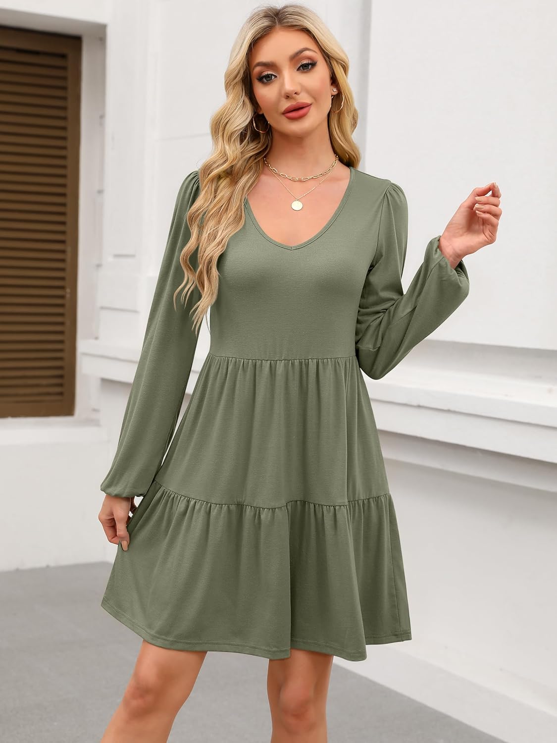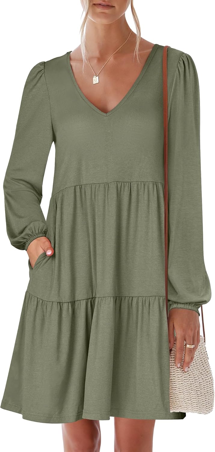 Home Clothing & Fashion Dresses ANRABESS Womens Long Sleeve Dress 2025 Fall Casual V Neck Tiered Flowy Short Dresses Beach Travel Vacation Outfits
