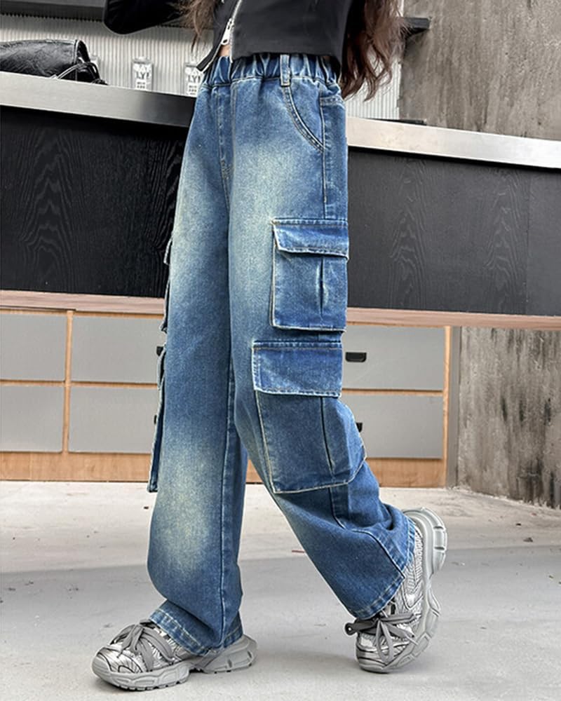 AOWKULAE Girls Jeans Cargo Pants Baggy Wide Leg High Elastic Waistband Kids Straight Denim Pant with Pockets 5-14Y