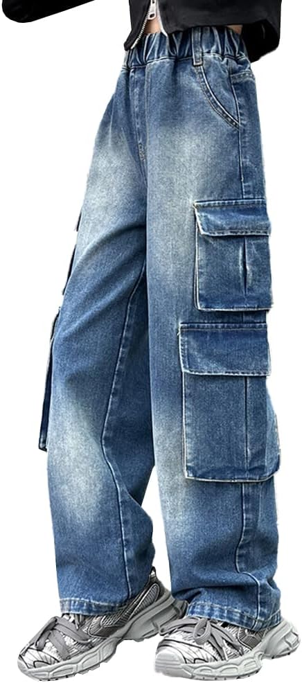 Home Clothing & Fashion Jeans & Pants AOWKULAE Girls Jeans Cargo Pants Baggy Wide Leg High Elastic Waistband Kids Straight Denim Pant with Pockets 5-14Y