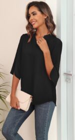 Fabric: Our blouses for women are made from great chiffon material, 100% Polyester. lightweight, soft, comfortable, and breathable to wear. You won’t feel hot and dry when you put on this tops. Size: Small(US 4-6), Medium(US 8-10), Large(US 12-14), X-Large(US 16-18), XX-Large(US 20-22), Please check your measurements to make sure the item fits before ordering. Features: Casual ladies chiffon blouse, fashion v-neck tshirt, half ruffle split sleeve, 3/4 sleeve tops, chiffon shirts loose fit, very breathable and cool material.