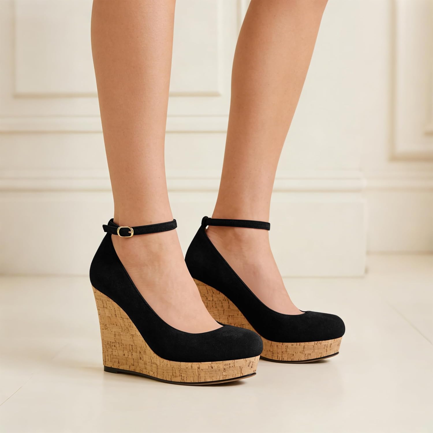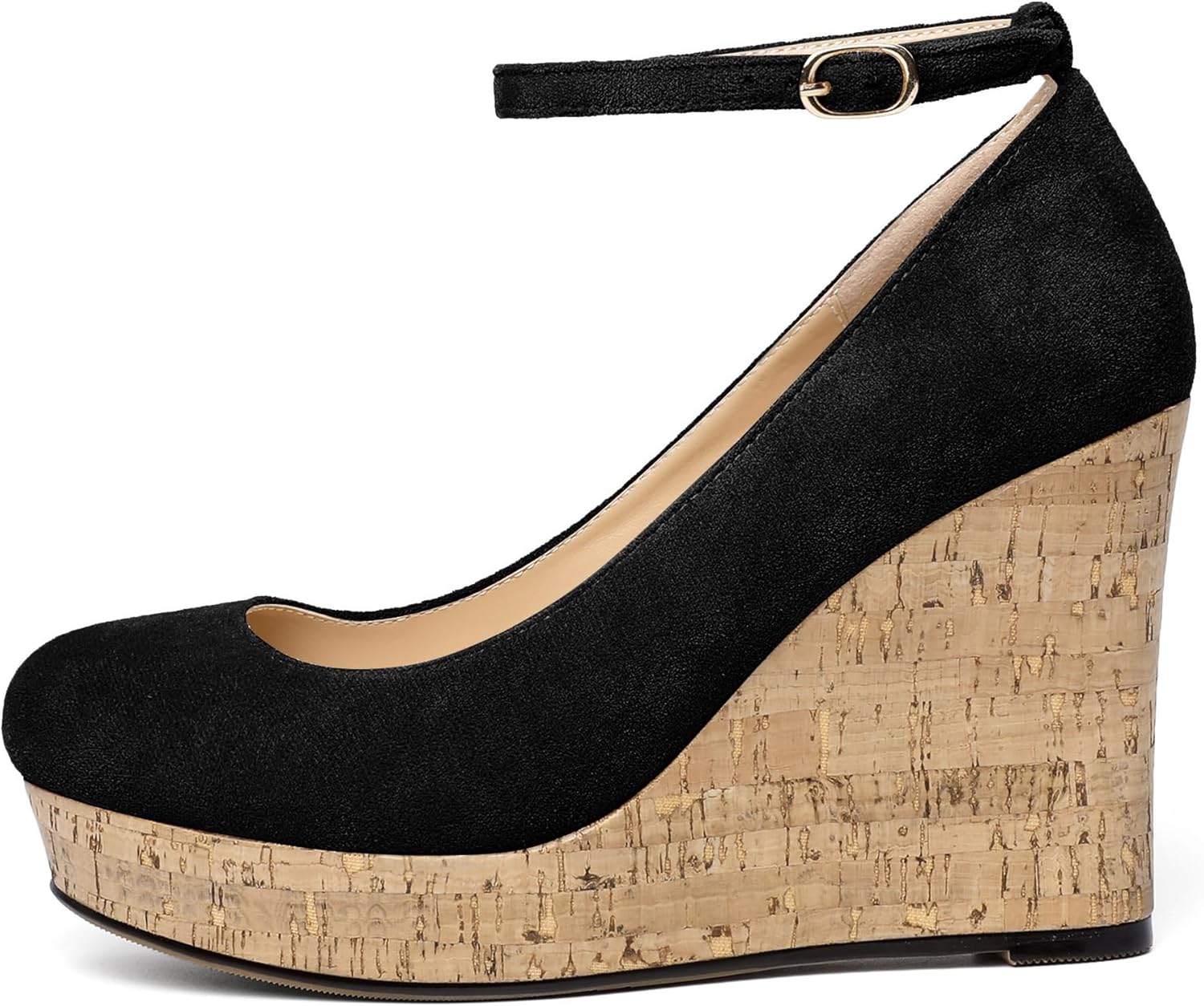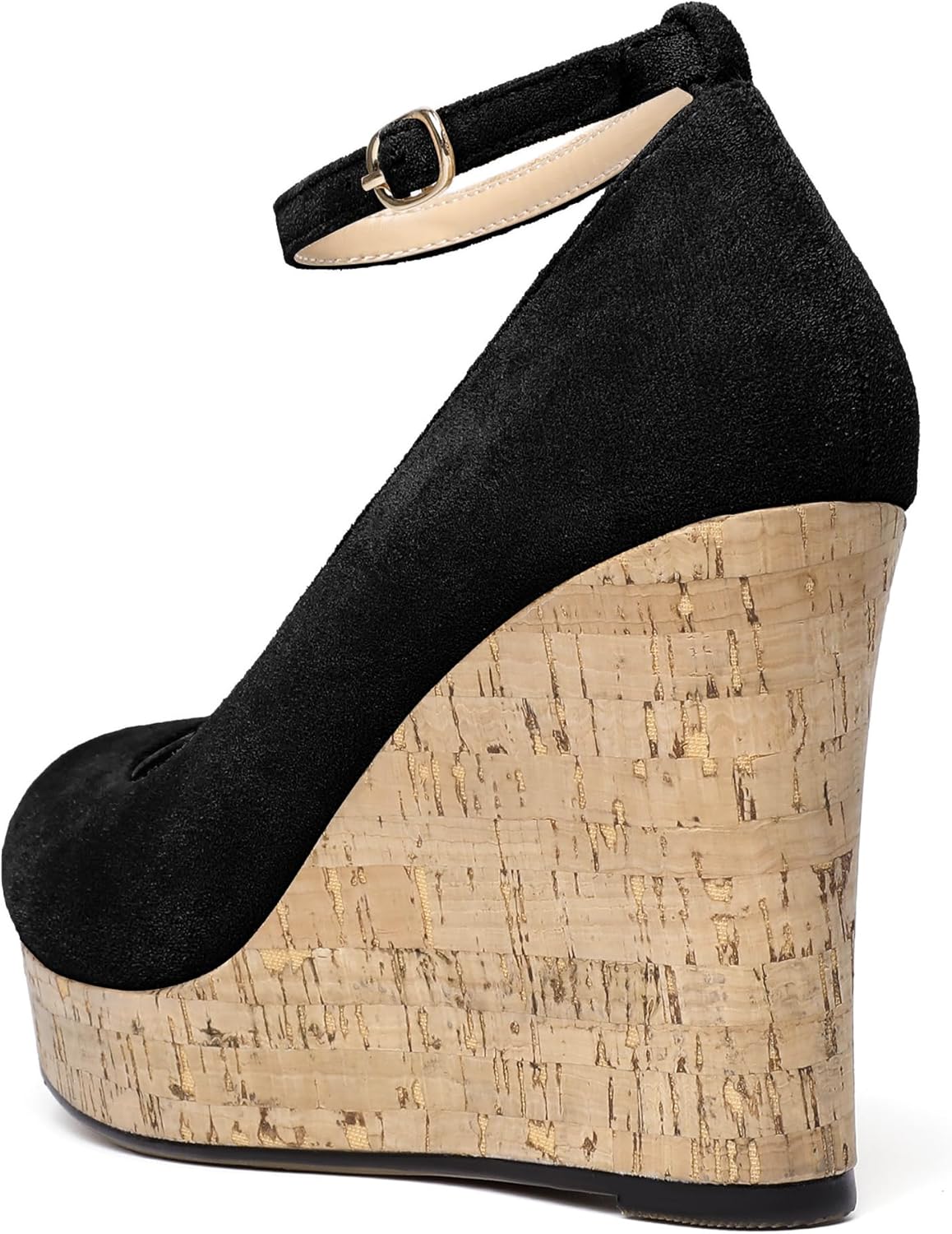 AUMOTED Women’s Platform Wedges Heels Pumps Closed Round Toe Buckle Ankle Strap Suede Heels Shoes for Ladies Casual Dress Summer 3.93 Inch High Heeled