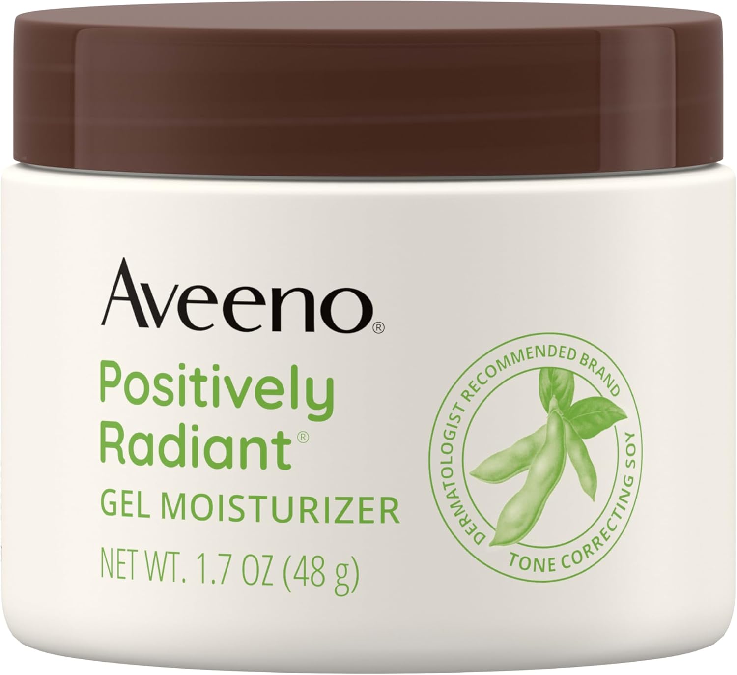 1.7-ounce jar of Aveeno Positively Radiant Daily Gel Facial Moisturizer with hyaluronic acid and clinically-proven tone-correcting soy evens skin tone and texture to reveal healthy-looking skin